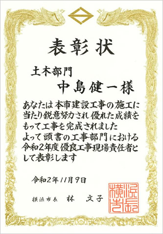 2020年 11/9(月)に横浜市庁舎にて、令和2年度 横浜市優良工事表彰式が開催され、弊社の中島健一が『優良工事現場責任者表彰』を受賞いたしました。横浜市優良工事表彰は、横浜市から発注された工事を施工した請負人や現場代理人のうち成績が優秀なものが表彰されるものです。これも協力企業様のご支援とご指導の賜物と、深く感謝しております。