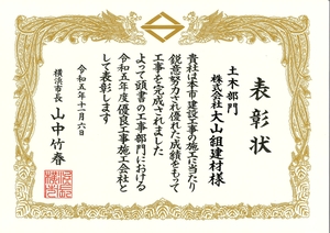 2023年11月6日 横浜市庁舎にて、令和4年度に完成した横浜市発注工事で特に優れた工事成績を収めた施工会社が表彰される「横浜市優良工事施工会社表彰 土木部門」を弊社が受賞いたしました。これもひとえに、発注者様、協力企業様、地域の皆様のおかげです。